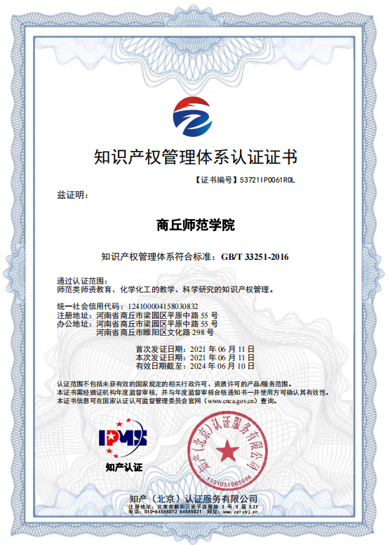 6月中旬,商丘师范学院顺利取得《知识产权管理体系认证证书》,成为河南省首所通过知识产权“贯标”认证的高校。